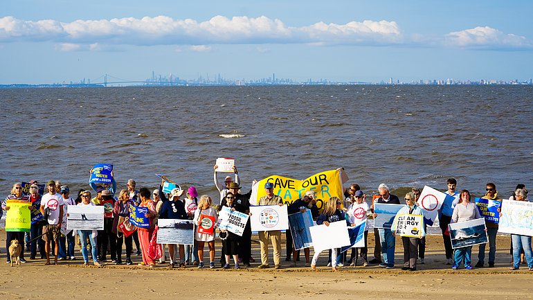 At the rally, COA Executive director, Cindy Zipf led the charge in welcoming the inspiring roster of leaders speaking at the event. These speakers highlighted a variety of issues including climate change, the impacts on the bay and the ocean, environmental justice, and air quality. As a final action rallygoers marched down to the water to draw a line in the sand to tell Governor Murphy NOT IN NJ.