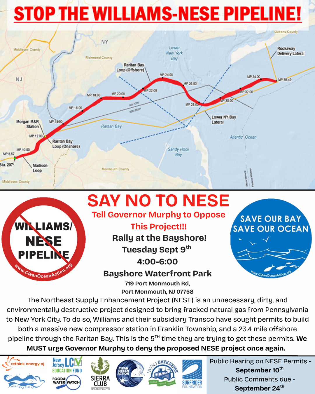 The Northeast Supply Enhancement Project (NESE) is an unnecessary, dirty, and environmentally destructive project designed to bring fracked natural gas from Pennsylvania to New York City. To do so, Williams and their subsidiary Transco have sought permits to build both a massive new compressor station in Franklin Township, and a 23.4 mile offshore pipeline through the Raritan Bay. This is the 5TH time they are trying to get these permits. Governor Murphy said no before, and we MUST urge him to deny the NESE project again.